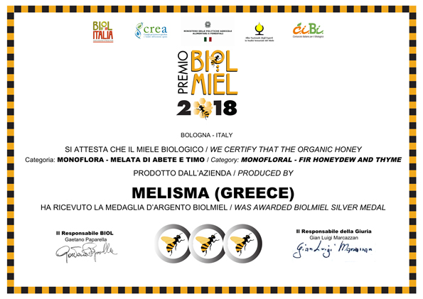 Ασημενιο μεταλιο στον παγκοσμιο διαγωνισμο βιολογικων μελιων biolmiel που ελαβε χωρα στην Bolognia Italy. Ένα χρυσό αστέρι στον παγκόσμιο διαγωνισμό τροφίμων Great Taste 2019.