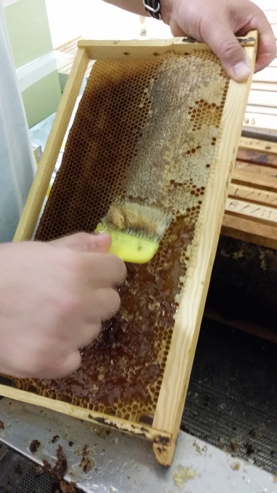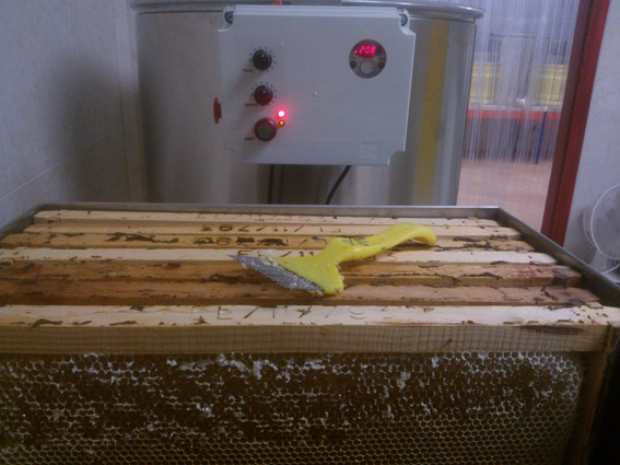 Το φορτίο με τις κηρήθρες έφτασε απ¨το μελισσοκομείο το μεσημέρι. Αμέσως ξεκίνησε το ξεμέλισμα στον φυγοκεντρικό μελιτοεξαγωγέα αφού πρώτα οι κηρήθρες απολεπίστηκαν απ¨το άσπρο κέρινο λέπι με το οποίο καλύπτουν οι μέλισσες τα κελιά με το μέλι όταν αυτό ωριμάζει.